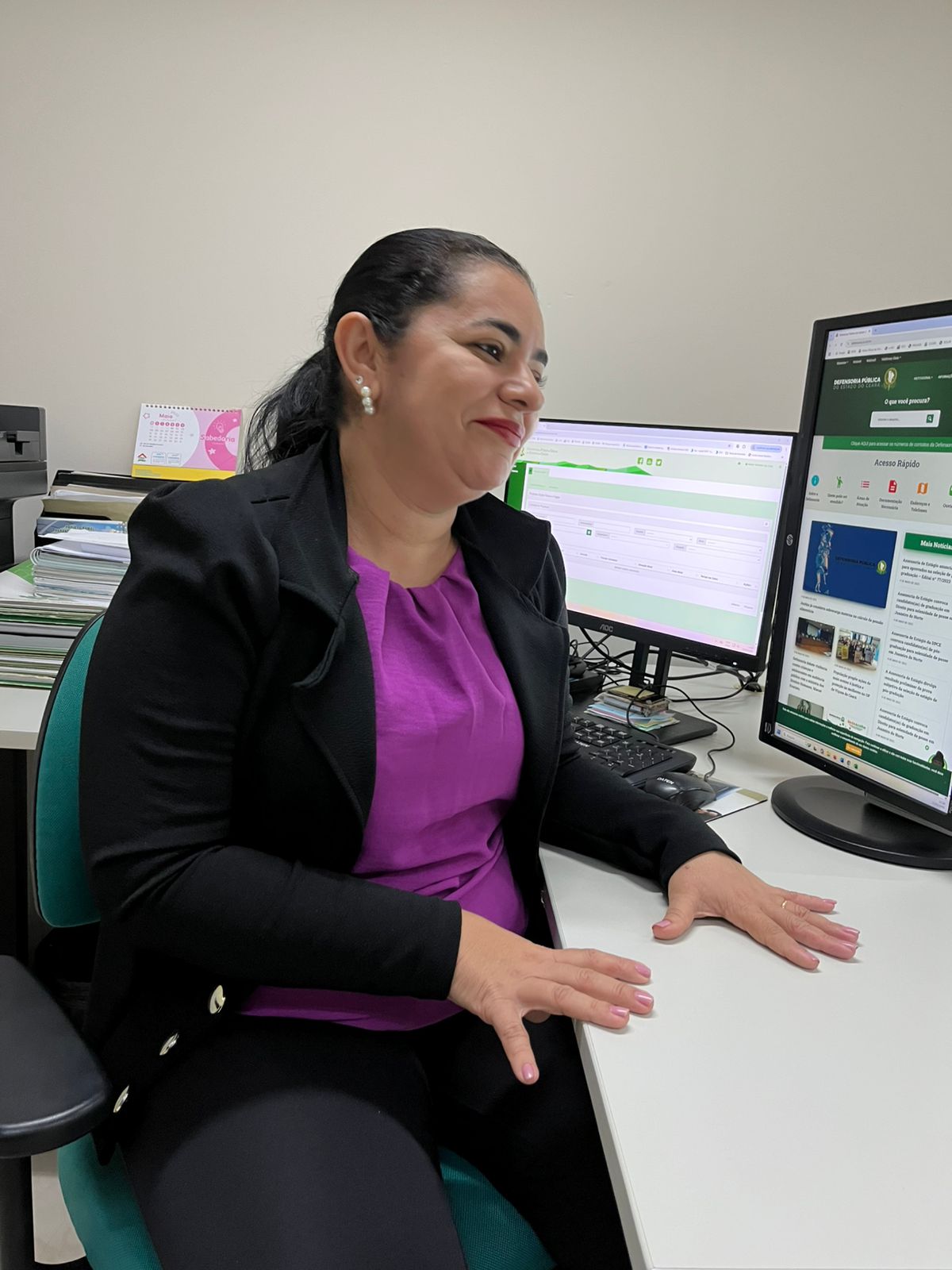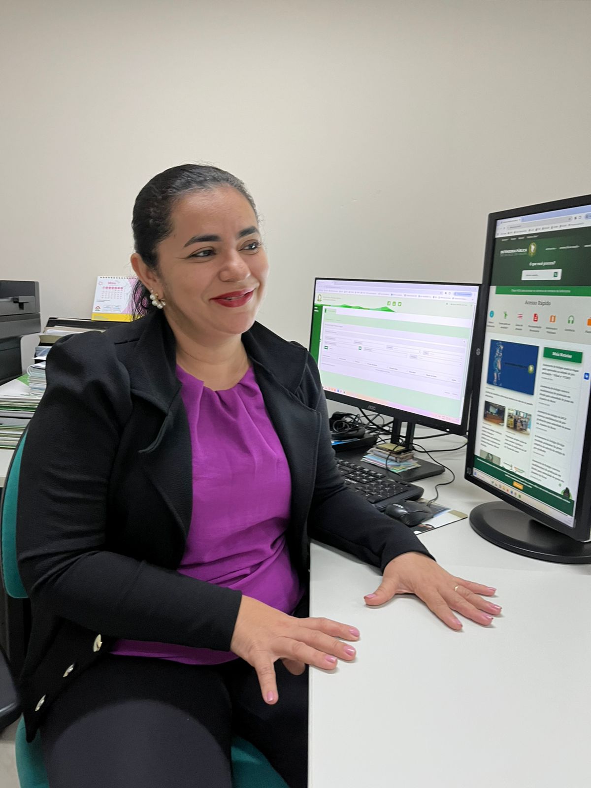 E todas as informações da Defensoria eram passadas por nós. Na recepção, a gente dava informação de documentação, questão de horário, de atendimento. Era uma recepção diferenciada, porque além de atender o público que procurava a Defensoria, a gente encaminha as petições, no caso, tudo via correios. A gente fazia tudo manual. Enfim, eram muitos trabalhos na recepção. Todas as contestações que vinham do fórum eram direcionadas para recepção e a gente tinha a responsabilidade de fazer todos os endereçamentos e também enviar, muitas vezes, via fax. Eita, via fax. (risos). Eu caí aqui de paraquedas e pensei: como é que eu vou fazer aqui? No começo, quando o telefone tocava, era meio que desesperador, porque você não sabe o que é que estava vindo, né? Qual era a pergunta, o tipo de atendimento. Então assim o tempo passou e fui aprendendo a cada dia. Foi meio assustador, mas foi muito bom, tanto que eu estou aqui até hoje. E hoje, já com 24 anos de Defensoria, eu posso dizer que a gente cresceu bastante tanto em termos de colaboradores, de defensores quanto da questão estrutural. Hoje, em termos de evolução de trabalho, a gente tem muitas ferramentas que a época a gente não tinha.