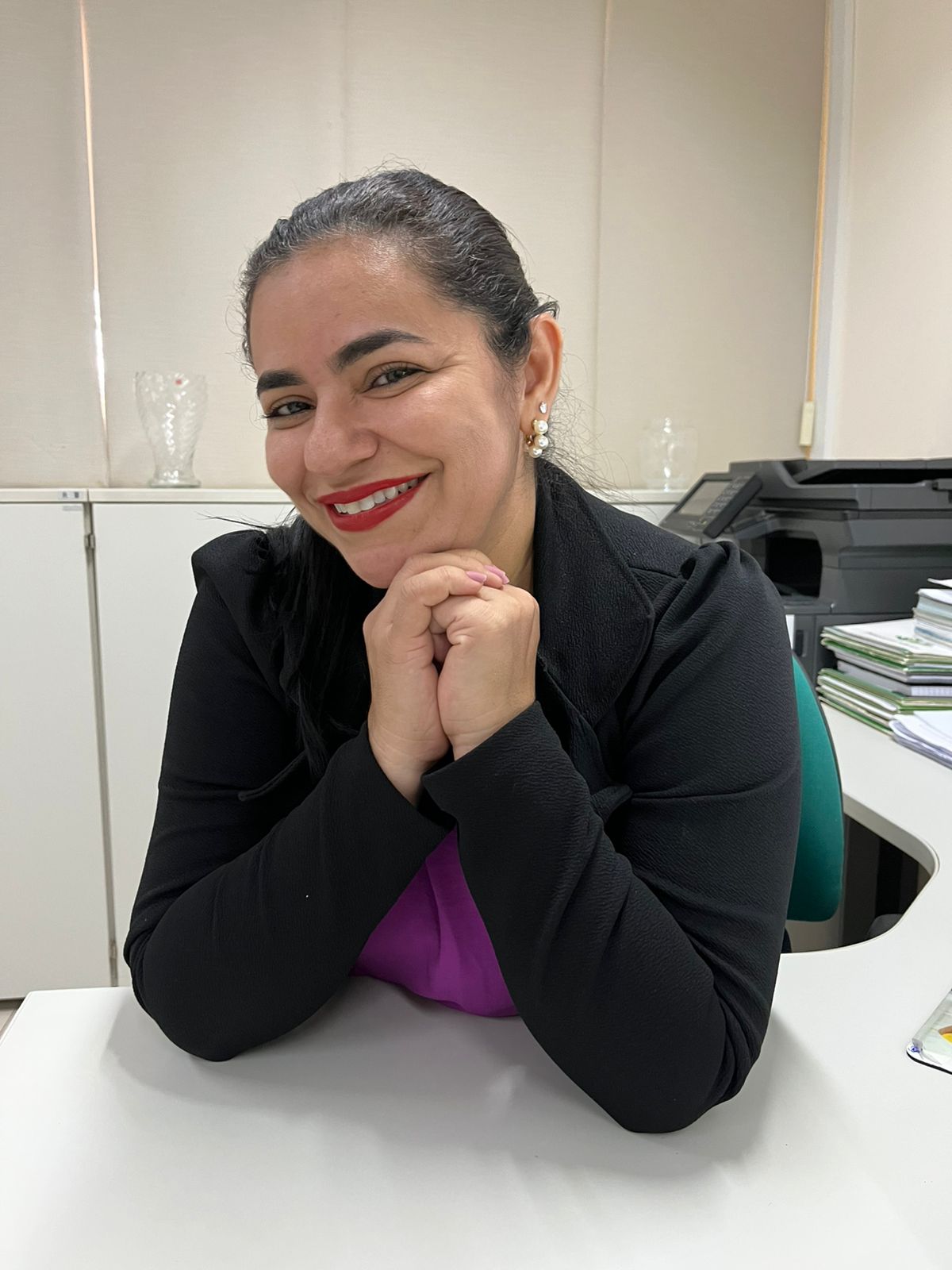 Eu amo a Defensoria, de verdade, porque se eu te disser o contrário eu estou mentindo, é tanto que eu estou aqui há 24 anos. Quando eu saí da recepção, fui para o Gabinete onde passei um bom tempo. Depois, o Almoxarifado estava numa situação complicada e me disseram que precisava de alguém, então fui lá, fiz todo o trabalho, organizei tudo direitinho e depois me disseram que o Gabinete precisava de mim. Saí do Almoxarifado, retornei ao Gabinete e depois veio a Corregedoria, a fim de ajudar na elaboração dos relatórios e me disseram: tem que ser a Simone. Então, recebi um convite da doutora Benedita, que eu aceitei, estou aqui até hoje. E nesses anos,  me apaixonei pela Defensoria em si. A Defensoria me ensinou muitas coisas na minha vida, certo? Hoje tudo que eu, vamos dizer, aprendi na área do Direito e muitas coisas para a minha vida mesmo, foi a Defensoria que me ensinou isso, entendeu? Então, eu amo a Defensoria de verdade. É tanto que eu não aceito quando alguém chega a falar mal da Defensoria para mim, me magoa bastante, porque eu sei que, claro,  às vezes acontecem algumas falhas, algumas coisas, mas a Defensoria é a esperança de muita gente. Das pessoas que realmente não têm condições, que são vulneráveis. E a Defensoria é isso. Já passei por várias gestões, todas, no meu ponto de vista, tem um pouquinho dessa construção. Cada uma deixa uma semente, porque eu conheço a história da defensoria, eu peguei a defensoria com 4 anos de idade. Um bebê. Ver a defensoria hoje, onde ela está, onde chegou, para mim é um orgulho muito grande. E saber que eu faço parte, que eu vi crescer e torço por ela a cada dia. Quando eu torço pela Defensoria eu to torcendo por mim, pelo pouquinho de cada um. Já teve outros colegas que saíram da defensoria e voltaram para a defensoria. Eu nunca tive esse pensamento. Todo dia eu acordo com muita alegria pra vir trabalhar, porque eu gosto. Me sinto bem. Me realizo ainda hoje.